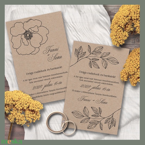 Fekete tussal rajzolt nagy méretű line art virágok-levelek díszítik ezeket a meghívókat. Igazán rusztikusan mutatnak a barna kraftpapíron, de kérheted fehér papírra is, a fekete helyett egyszínű vagy színátmenetes rajzzal.