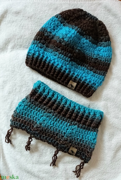 Türkizkék-barna színátmenetes, nagyobb méretű sapka és csősál gyapjú-akril fonalból