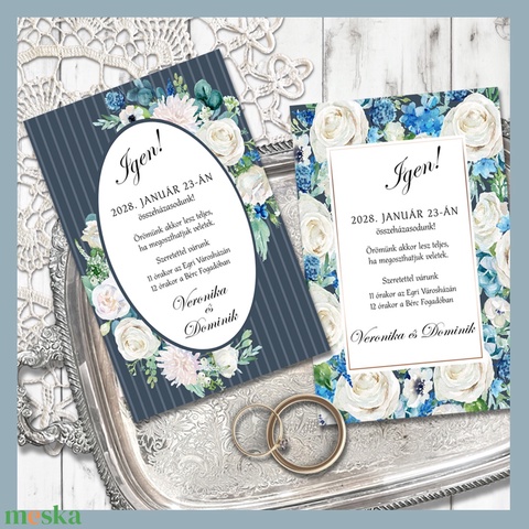 Törtfehér rózsák és kék színű apróbb virágok keretezik ezeket a meghívókat. Választhatsz ovális és szögletes keretek közül, világos vagy sötét háttérrel, vagy akár egy vintage csíkozású alappal.
