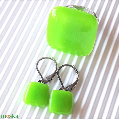 NEMESACÉL - Élénk almazöld üveg gyűrű és franciakapcsos fülbevaló orvosi fém akasztón, üvegékszer szett
