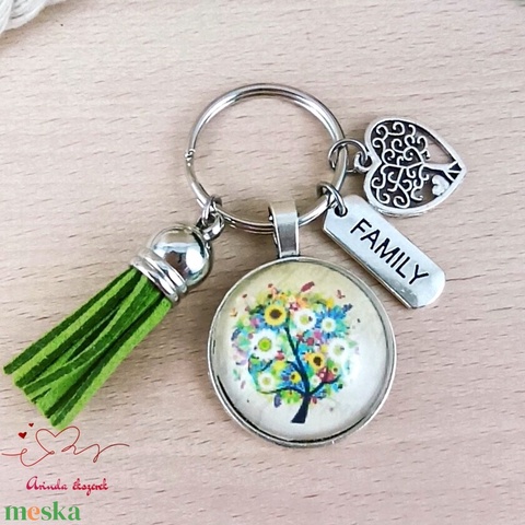 Életfa zöld bojtos üveglencsés kulcstartó táskadísz