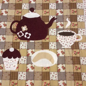 patchworkmintás takaró, falvédő teáskannával a közepén