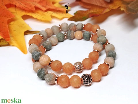 Matt ásványkarkötő páros narancs zebra jáspisból, aventurinból, rózsaarany cirkónia gömbökkel és korongokkal