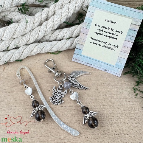 Füstkvarc ásvány angyal könyvjelző kulcstartó táskadísz szett