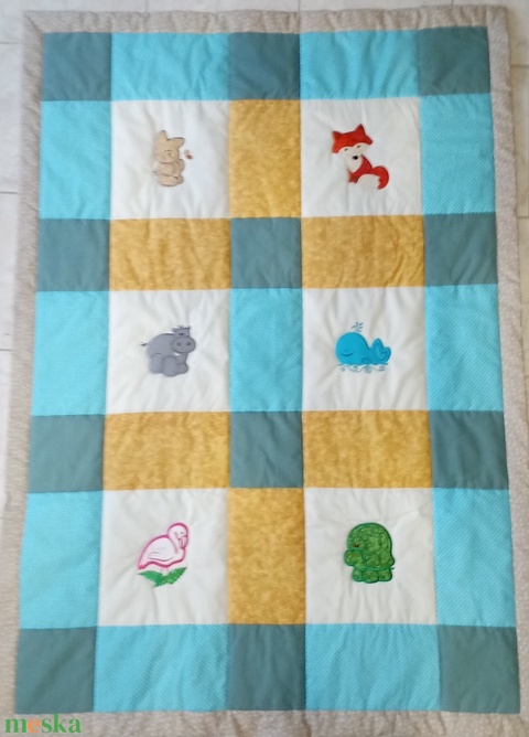 Bálnás, flamingós takaró türkízkék-olíva-sárga-drapp