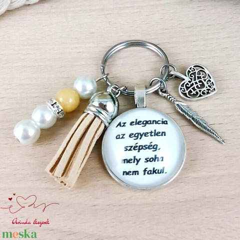 Az elegancia az egyetlen szépség feliratos bézs bojtos üveglencsés kulcstartó táskadísz