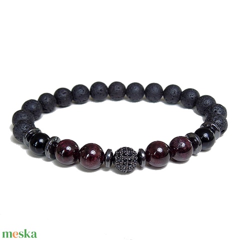 Férfi ásványkarkötő - gránát, ónix és lávakő férfi karkötő mikrostrassz gömbbel - férfi karkötő