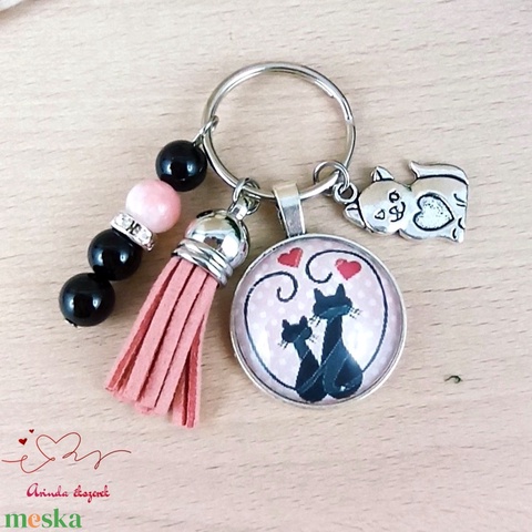 Szerelmes cicák rózsaszín bojtos üveglencsés kulcstartó táskadísz