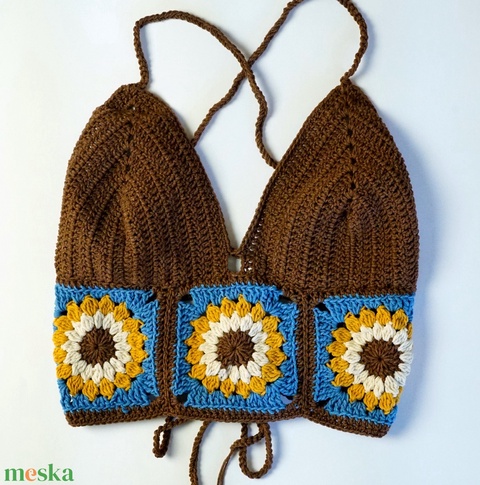 Napraforgós horgolt top, Fűzős horgolt nyári felső, Virágos horgolt croptop