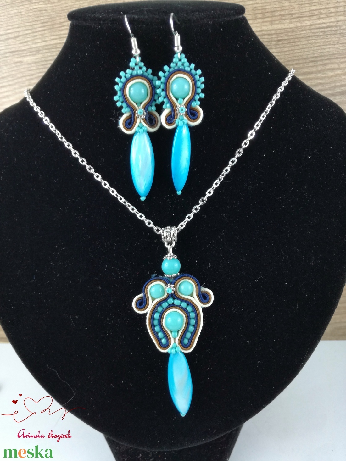 Középkék kagylóhéj kabosonokból és üveggyöngyökből készült mutatós, rafinált szett. A gyöngyöket krém, sötétkék és barna zsinórokkal, kék gyöngyökkel öleltem körbe. Aprólékos munkával készült, antik ezüst színű elemekkel díszítettem. Különleges és egyedi, melyet hétköznapokra és alkalmakra is bátran viselhetsz.