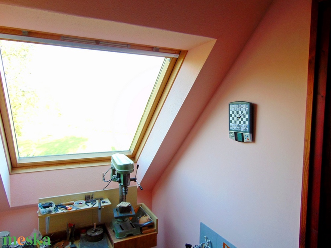 sakkgép, óraszerkezet mutatókkal, papír, lamináló fólia, mágnes, fatipli, műanyag