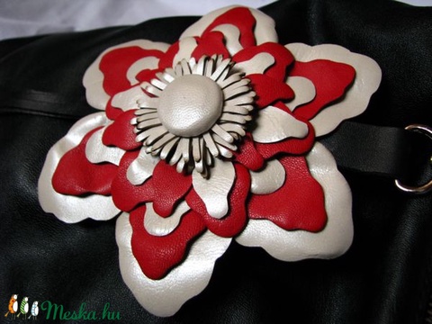 Piros és metál fehér virág bőr táskadísz, fityegő