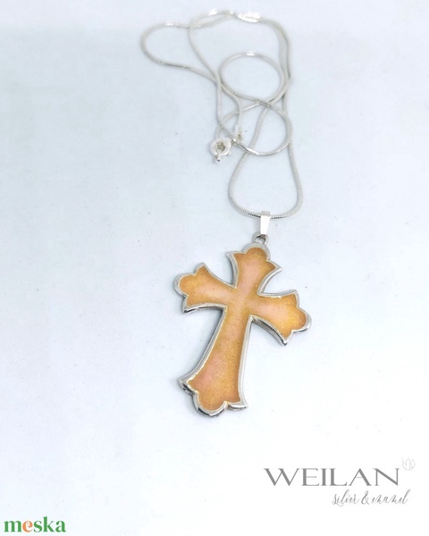 Kereszt - ezüst tűzzománc ékszer, medál (barackvirág színű)