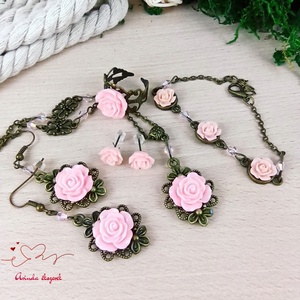 #21 rózsaszín rózsás szett nyaklánc fülbevalók karkötő gyűrű esküvő alkalmi koszorúslány örömanya menyasszony násznagy