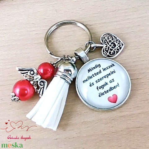 Mindig melletted leszek feliratos piros bojtos üveglencsés kulcstartó táskadísz karácsony