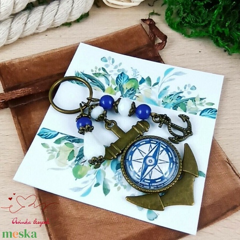 Kék és fehér gyöngyökből, iránytű mintával díszített üveglencsés kabosonból készült kulcstartó vagy táskadísz. A gyöngyöket gazdagon díszítettem antik bronz gyöngykupakokkal és köztesekkel, így igazán stílusos darab lett.