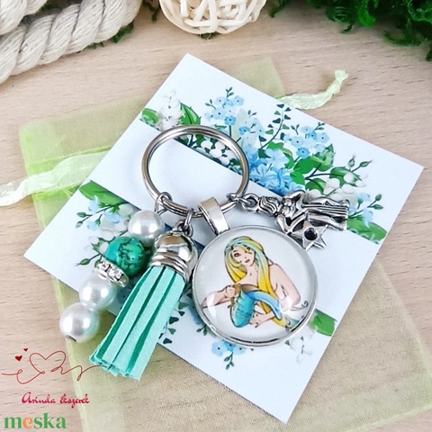 Vízöntő horoszkópos bojtos üveglencsés kulcstartó táskadísz bojtos mikulás karácsony szülinap névnap nyár ajándék
