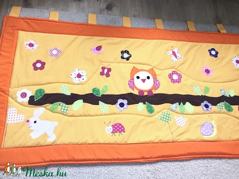 Narancssárga patchwork falvédő, takaró bagoly és virág, nyuszi applikációval