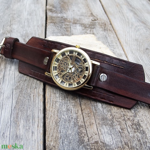 Férfi kézműves karóra, Skeleton férfi karóra, Steampunk karóra arany színű óralappal