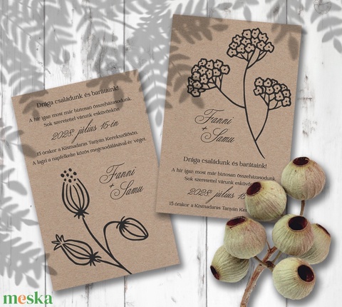 Fekete tussal rajzolt line art vadvirágok díszítik ezeket a meghívókat. Igazán rusztikusan mutatnak a barna kraftpapíron, de kérheted fehér papírra is, a fekete helyett egyszínű vagy színátmenetes rajzzal.