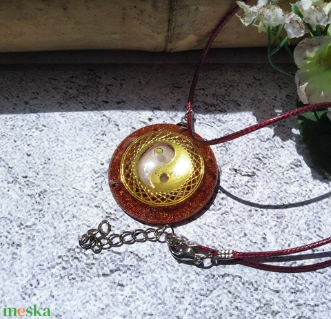ORGONIT JIN-JANG medál hegyikristály, kunzit és rózsakvarc ásványokkal 45 + 5 cm-es viaszos szálon. A 4 cm átmérőjű, domború medál középpontjában a réz JIN-JANG szimbólummal.