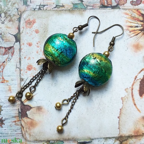lámpagyöngyök, fülbevalóalap, szerelőpálcika, fémgyöngyök, bronz lánc