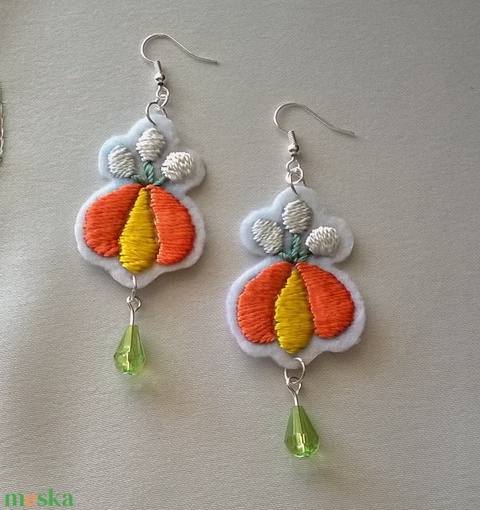 - Anyaga: filc, kordonet selyem fonal, gyöngy, szerelőkarika, fülbevalóalap