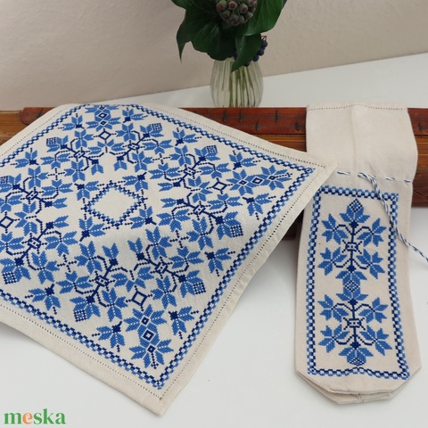 Tiszavidéki, beregi keresztszemes hímzett kisterítő és bortartó szett (11.)