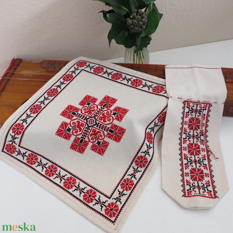 Tiszavidéki, beregi keresztszemes hímzett kisterítő és bortartó szett (5.)