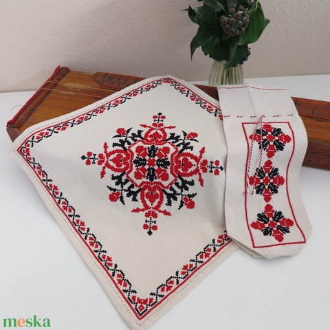 Tiszavidéki, beregi keresztszemes hímzett kisterítő és bortartó szett (3.)