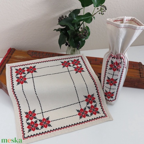 Tiszavidéki, beregi keresztszemes hímzett kisterítő és bortartó szett (1.)