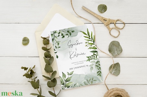 greenery esküvői meghívó, 2 oldalas, zöld leveles esküvői meghívó