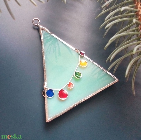 Karácsonyfa teljes pompájában, egy menta zöld, halvány zöld üvegdarab, rajta színes fényfüzér.