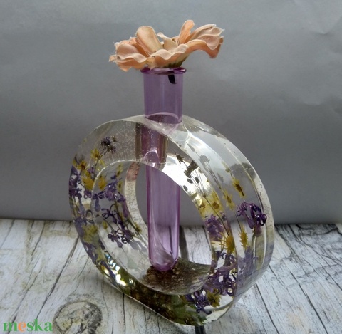 Örök tavasz váza, szárított virágokkal, levelekkel, mohával gyantába öntve
