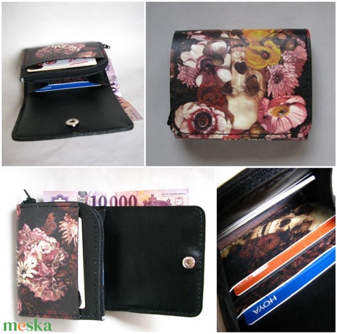 Koponya és virág mintás bőr pénztárca