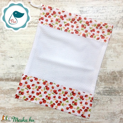 Eper mintás gyümölcs zsák - bevásárló textil zsák - újra hasznósítható zsák - újra zacskó - zöldség gyümölcs zsák
