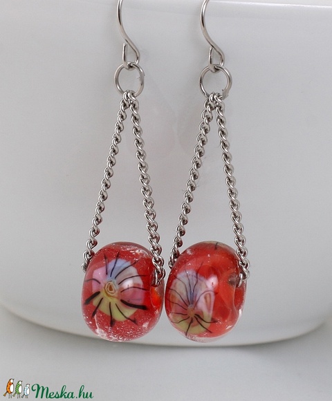 Korallpiros, medúzamintás lámpagyöngy fülbevaló, üvegékszer