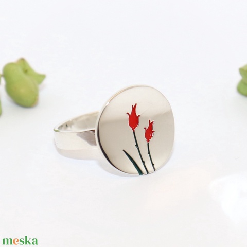 Piros rózsás, kerek, női ezüst gyűrű, 60-as méret, állítható (EGY.235)