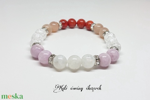 Ásvány neve, mérete: kunzit és holdkő 4-4 db. 8 mm-es., szivárvány holdkő 3 db. 8 mm-es, korall 4 db. 8 mm-es, repesztett hegyikristály 6 db. 8 mm-es
