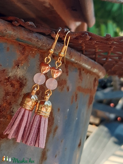 Halvány lila színű színű bojtot díszítettem 6mm-es rózsakvarc ásványgyöngyökkel, és rosegold színű, szív formájú hematit köztesekkel.