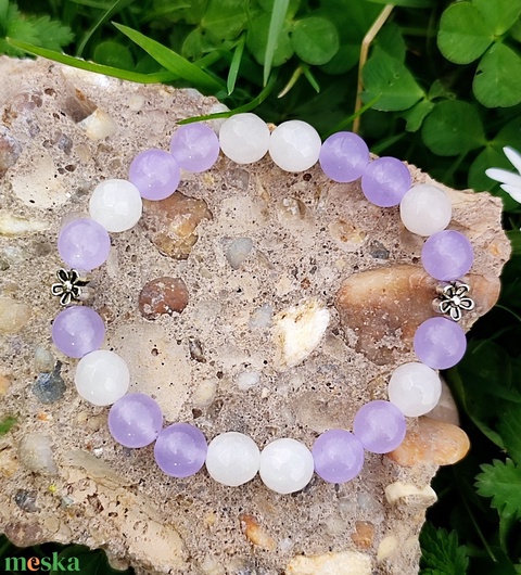 Jáde ásványkarkötő, lila - fehér ásványkarkötő, virágos ásványkarkötő, egyedi ásványkarkötő