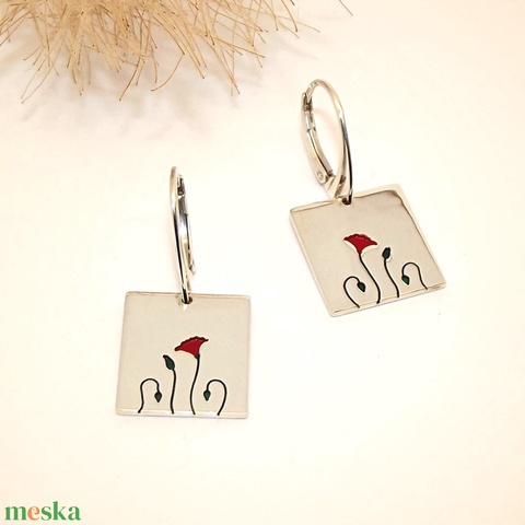 Piros pipacsos téglalap, patentos, női ezüst fülbevaló pár (EPK.15)