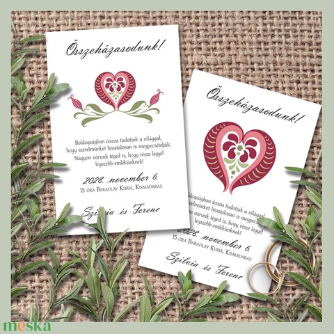 Egy skandináv jellegű, folk art stílusú szív motívum a központi eleme ezeknek a meghívóknak.