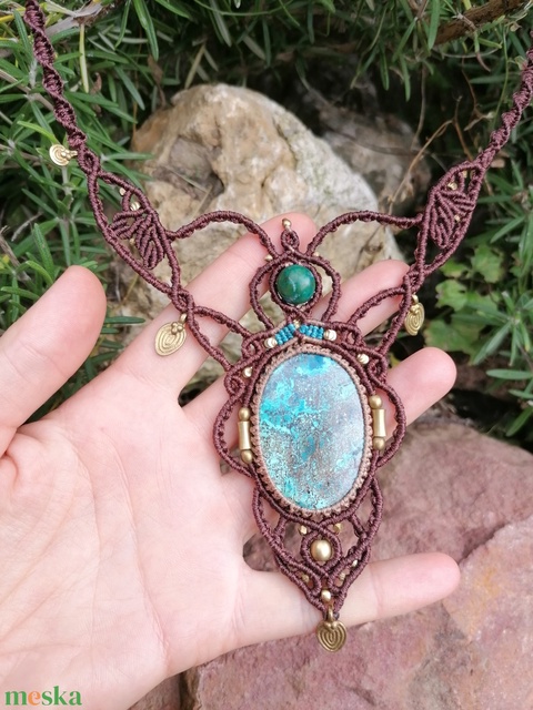 - Anyaga: makrame fonal, lápiszlazuli, féldrágakő, türkiz, réz gyöngy, kő
