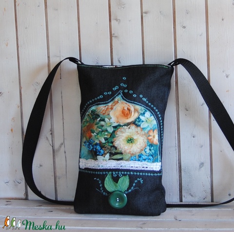 Rita- színes mintás textillel díszített és hímzett farmertáska