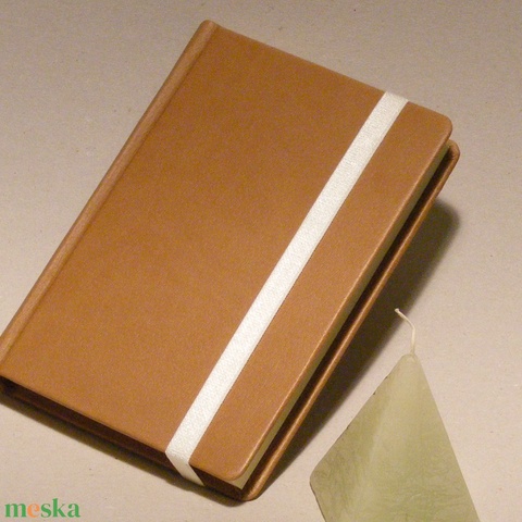 Napló, jegyzetfüzet, barna notesz kézzel fűzött sima lapokkal, gumival. Középbarna műbőr borító, kockás előzékpap