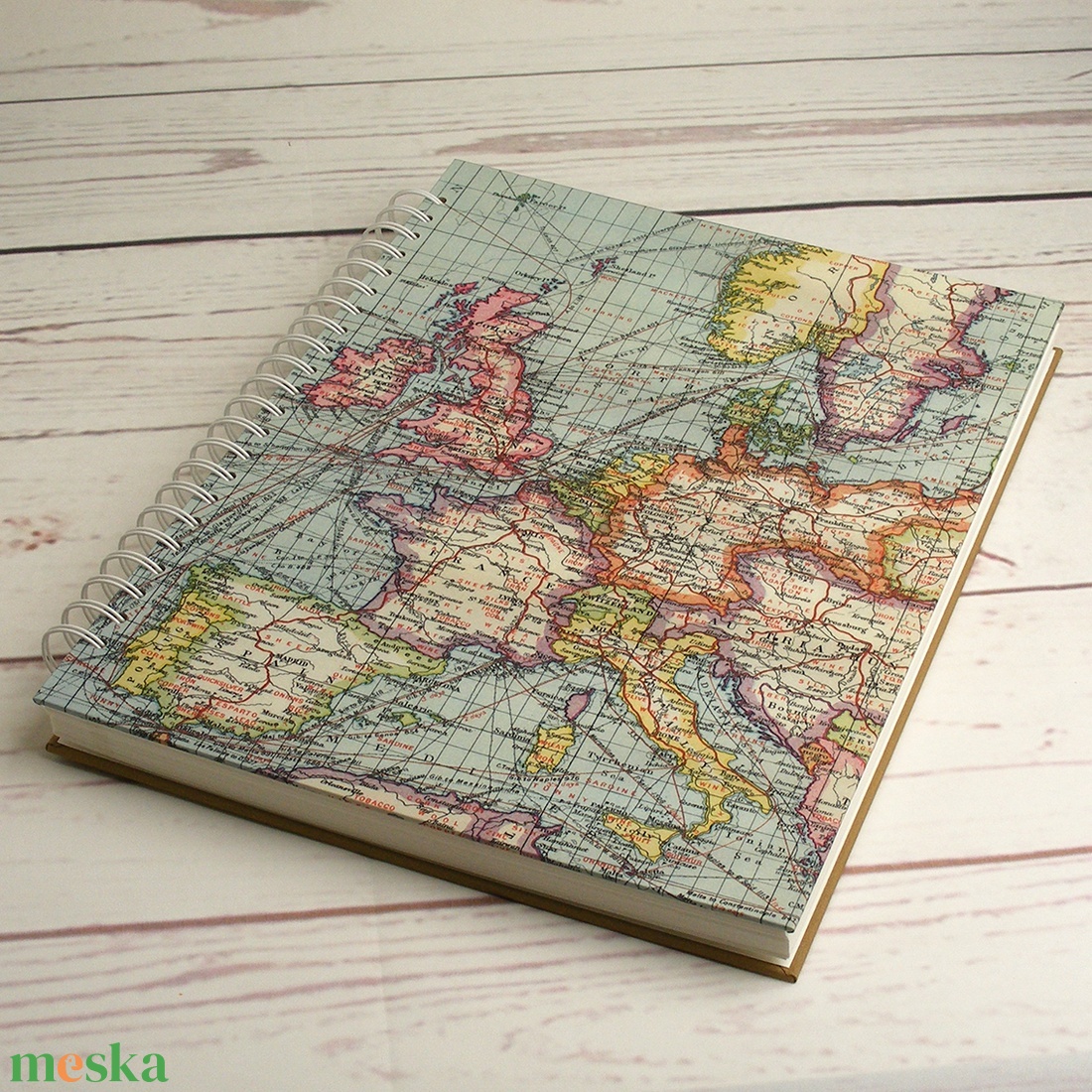 Nagyméretű fotóalbum, utazási album, spirálos fényképalbum, emlék utazóknak. Borítón régi Európa-térkép, hátul vászon