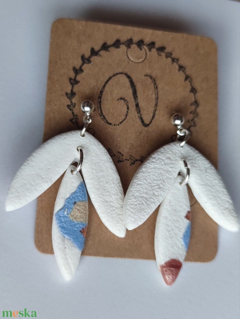 Fehér alapon világoskék, bézs és óarany színű foltmintával készült fülbevaló
