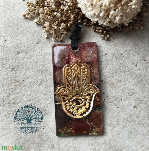 ORGONIT védelmező női erő medál achát és rózsakvarc ásvánnyal, réz forgáccsal, alumínium lappal, réz Hamza, azaz Fatima kezével 45 cm-es valódi bőr szálon. A medál 2 cm széles, 4,8 cm magas.