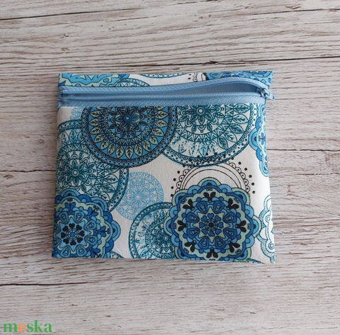 Egészségügyi betét tartó,intim betéttartó,vízhatlan anyaggal bélelve,fehér alapon türkizkék mandalás vászonból,NoWaste